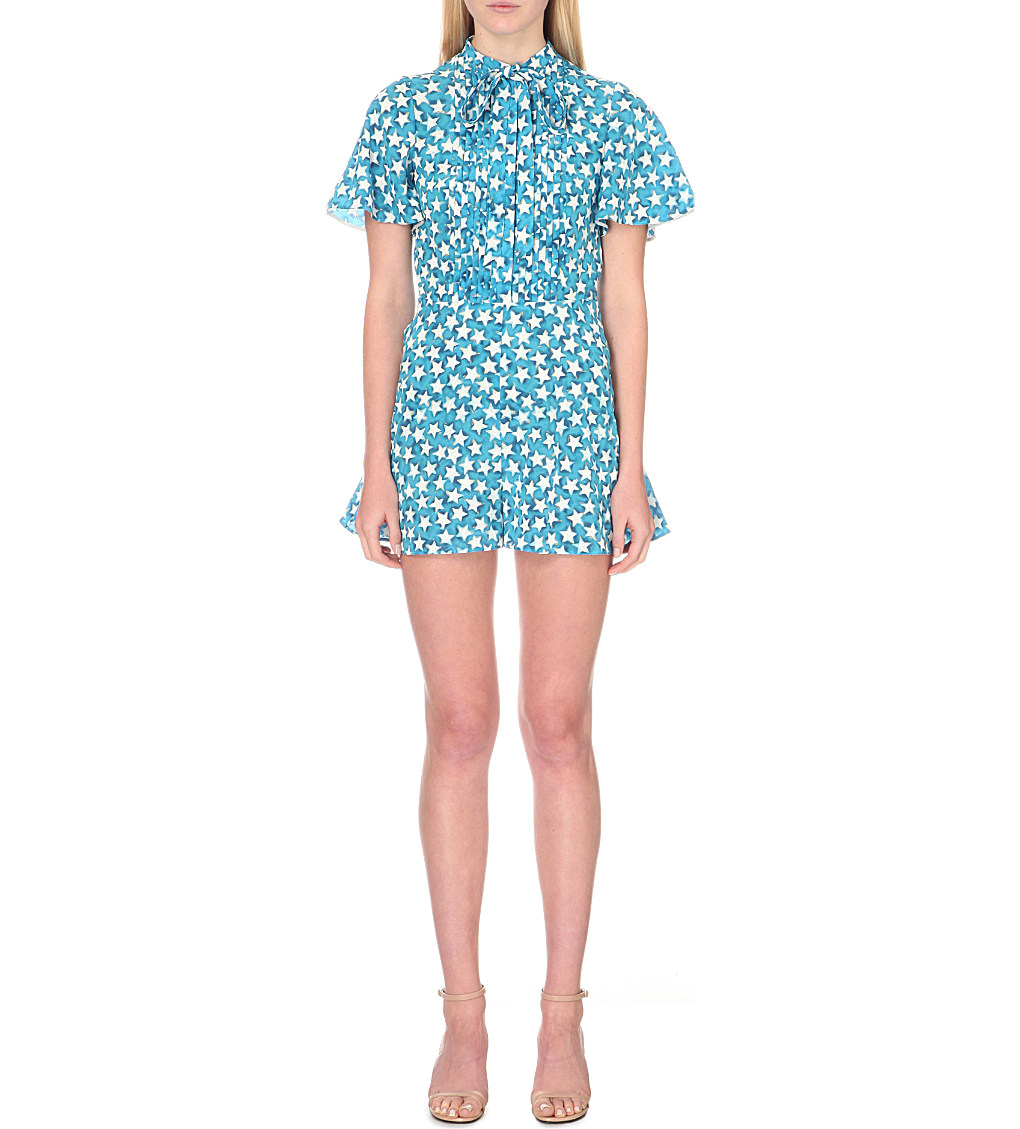 Her silk playsuit boasts a round neck, pussy bow detailing, short sleeves, an allover star print, and pleated bib.