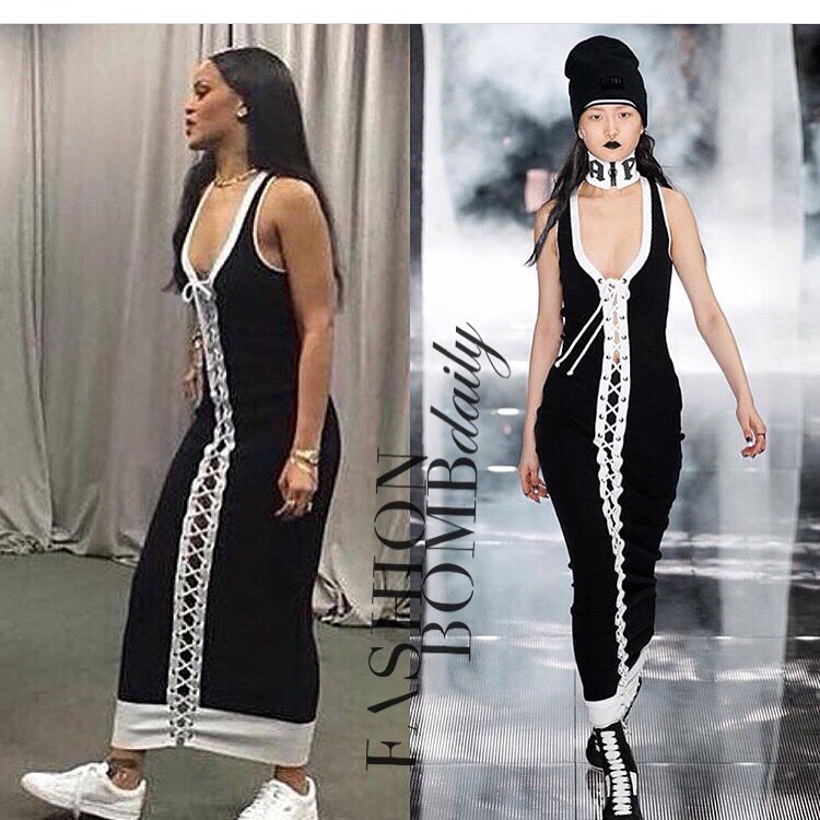 Queen Rih sported a new looking from her upcoming Fenty x Puma Fall 2016 collection during her Anti tour, donning this black and white lace up dress: