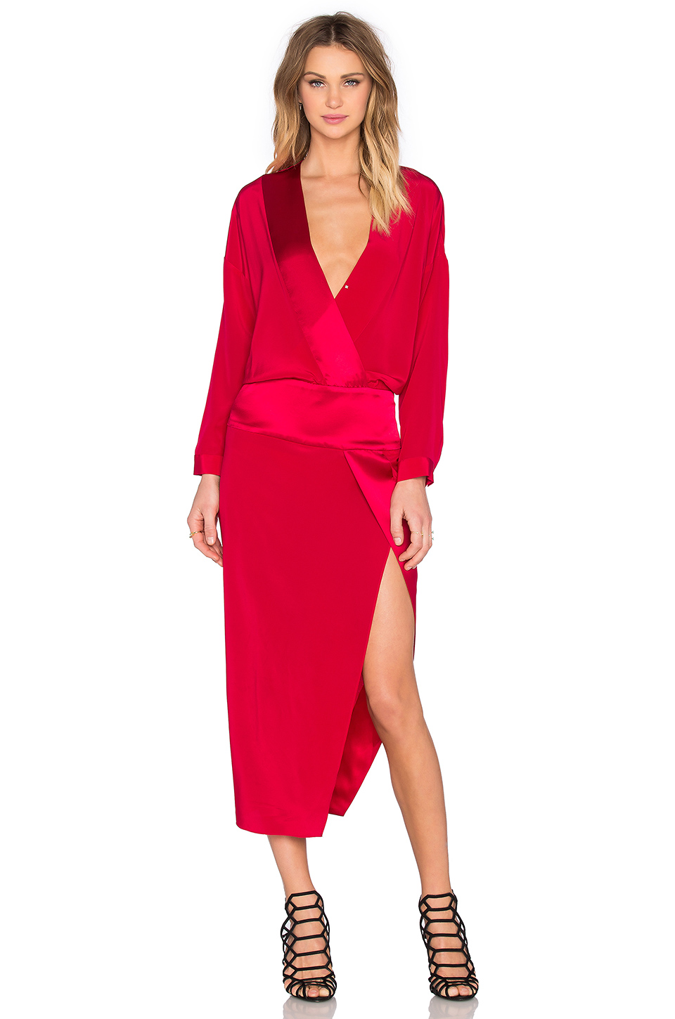 The dress is made from silk, draping across to create a wrap style around the front. Along with button cuffed sleeves and a plunging neckline, it also features a high thigh slit.