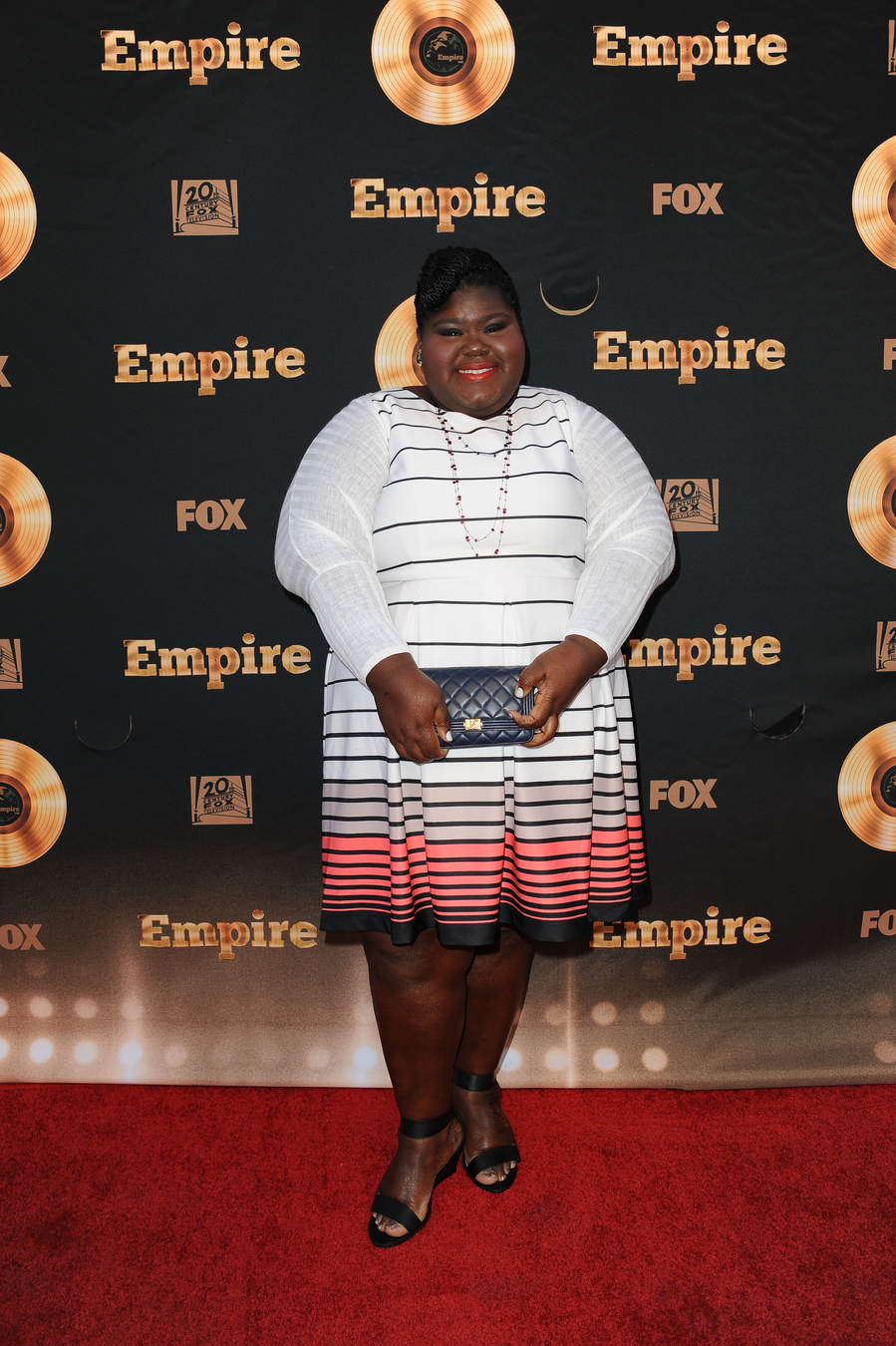 Gabourey Sidibe looked pretty in a knee length black, white and peach striped dress. She partnered her outfit with a black clutch and black open-toe sandals.
