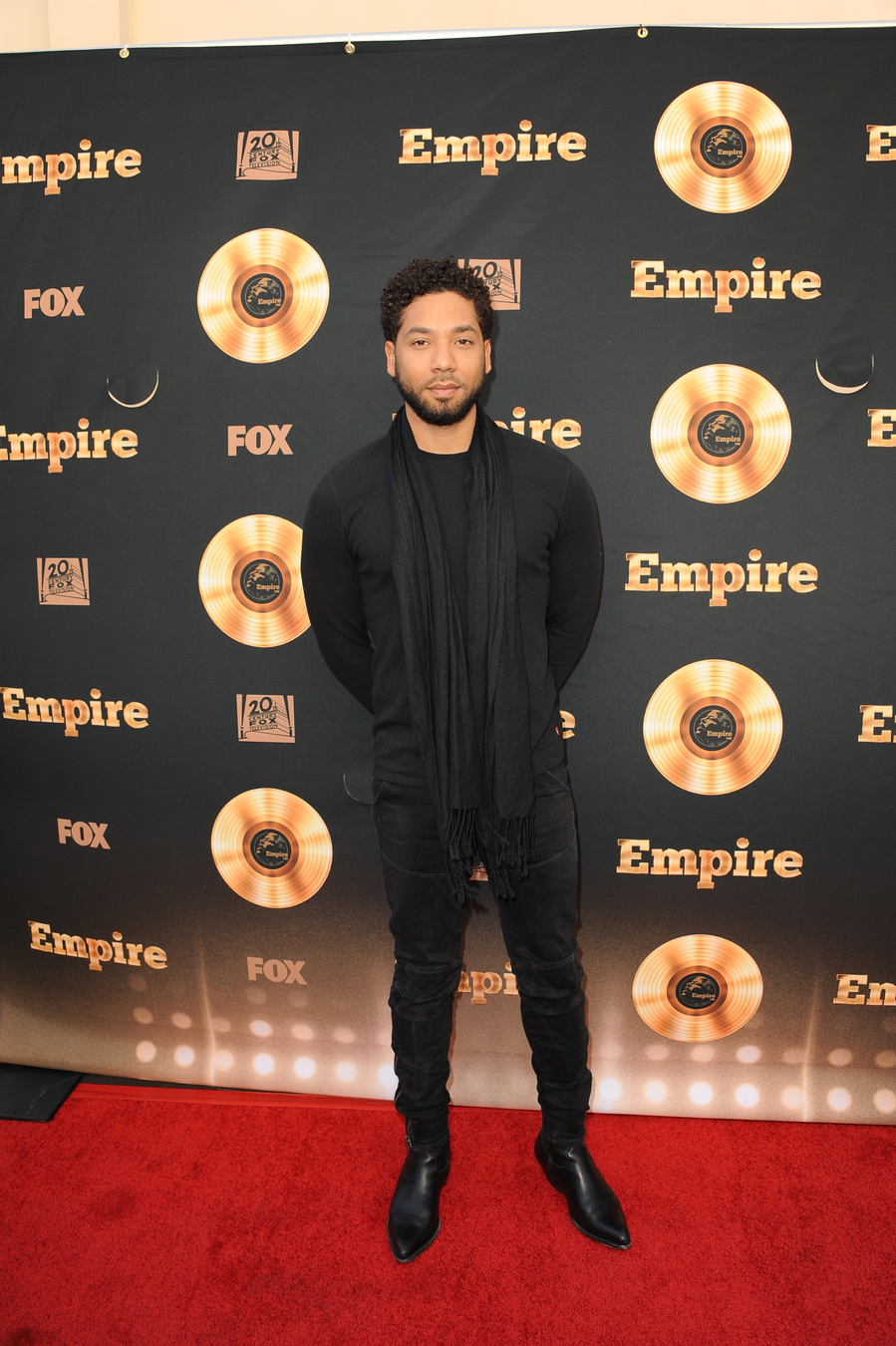 Jussie Smollett went the ‘All black everything’ route in a pair of black fitted pants, a black long sleeve shirt and black scarf. Love his look, especially the beard!