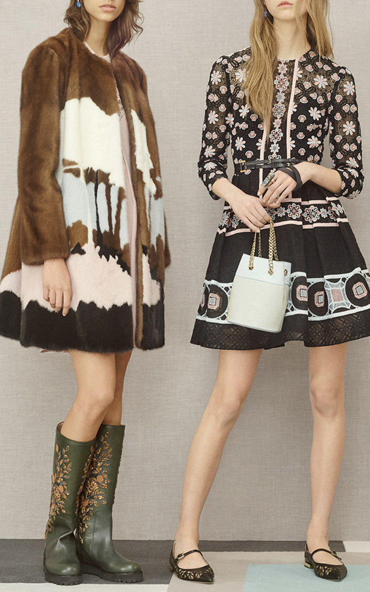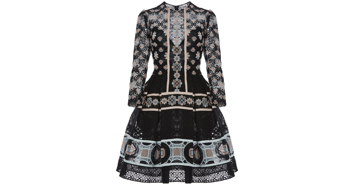 The dress features a floral sheer top with a brocade skirt. Originally seen in the Pre-Fall 16 collection, the dress comes in black with pastel pink and blue decoration.