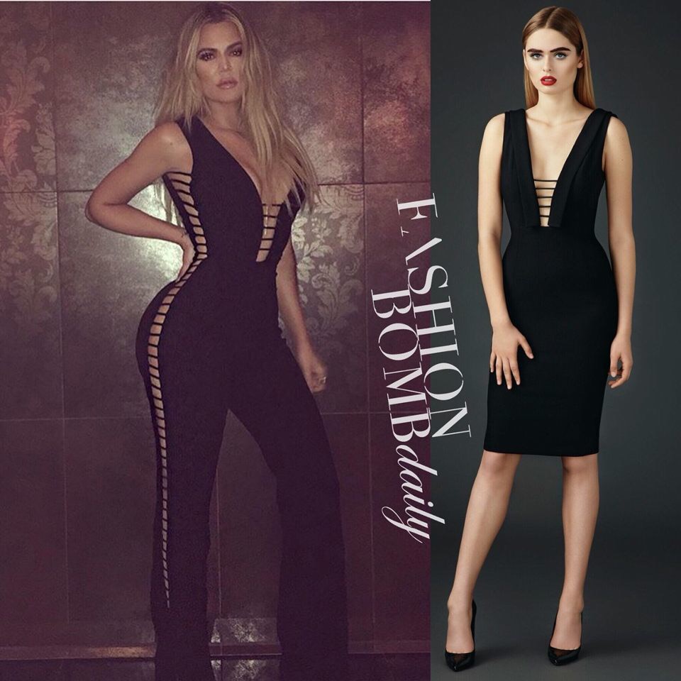 The dress version features lace up detailing in the front, however, Khloe’s jumpsuit also sported the popular lace trend up the sides.
