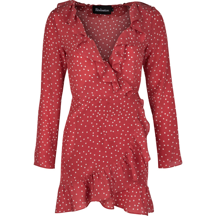 Her long-sleeve dress features a wrap silhouette, adjustable string tie closure around the waist, ruffled neckline and hem, and an allover star print.