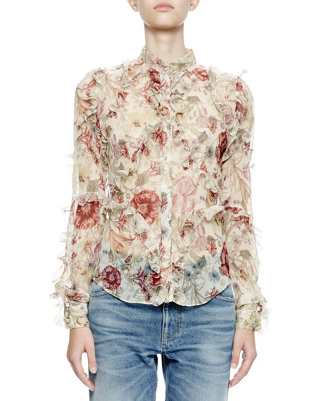 The silk floral print chiffon blouse has long sleeves with ruffles scattered throughout the top.