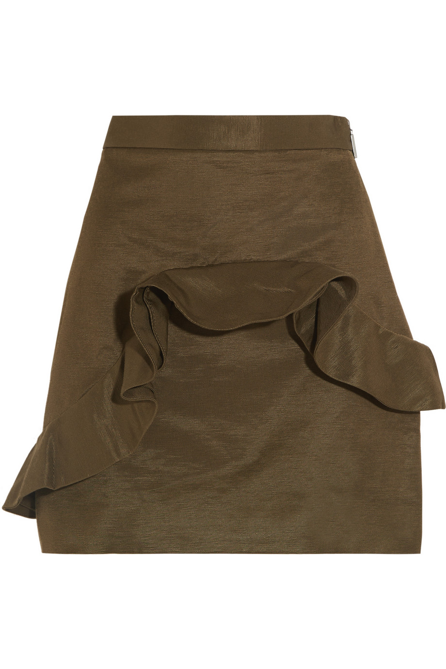 The army-green cotton-blend faille skirt features a structured A-line silhouette and is finished with an asymmetric ruffle.