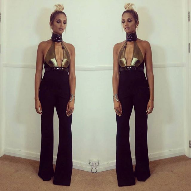 Britain’s Got Talent judge/fashion fave Alesha Dixon stopped the world as she flexed for the ‘Gram in a custom Sergio Hudson Metallic Cutout Jumpsuit, a blonde top knot and jewelry by Gaelle Khouri and Joanna Laura Constantine.