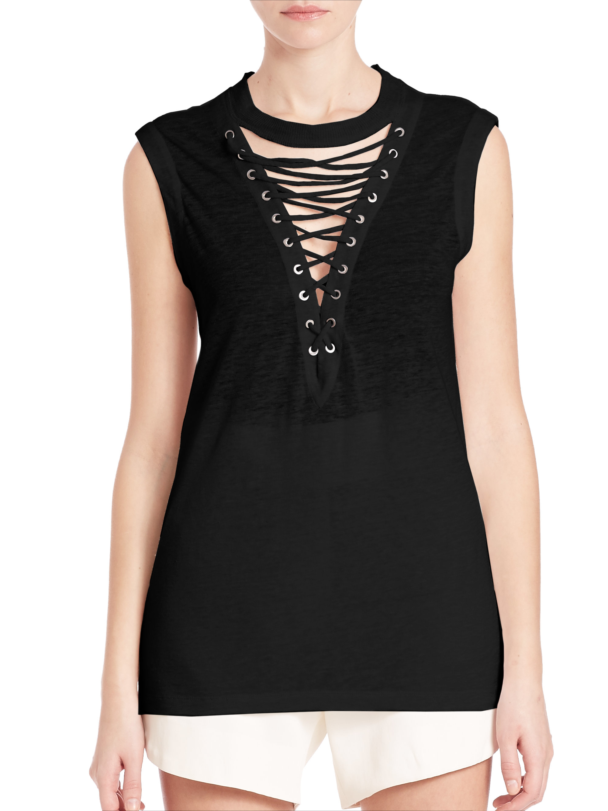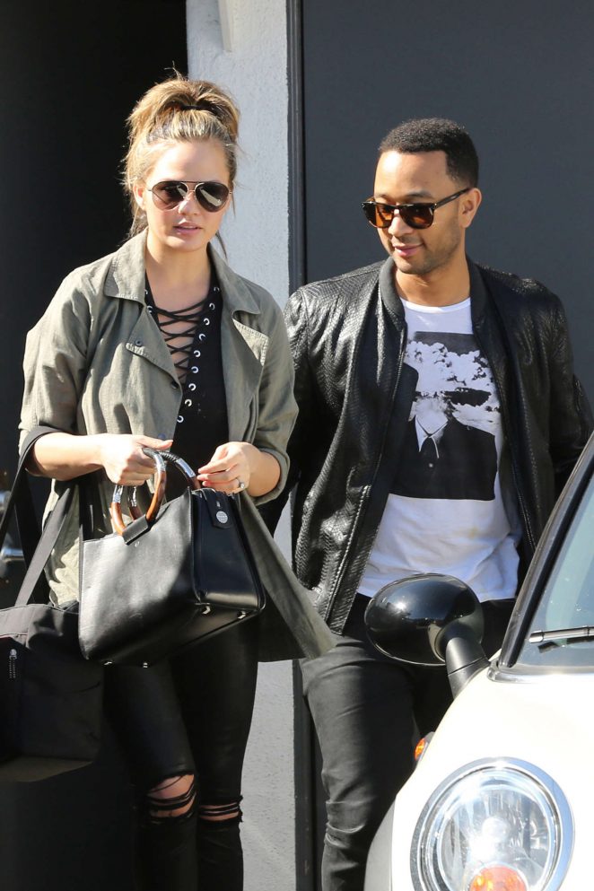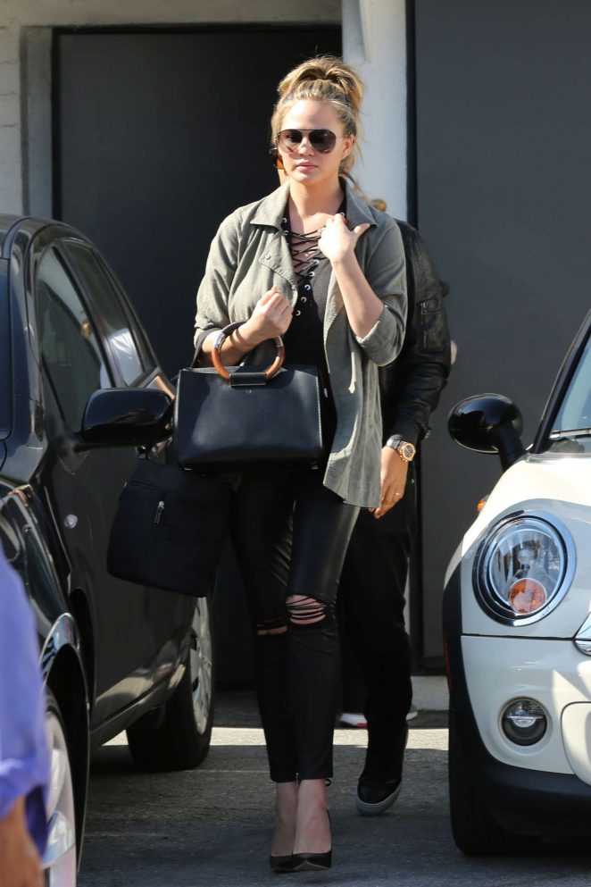 Chrissy Teigen exited a salon in LA, sporting a $198 Rails Sage Nadia Trench, $228 IRO Black Tissa Lace Up Tank, and The Row Round Handle Tote Bag: