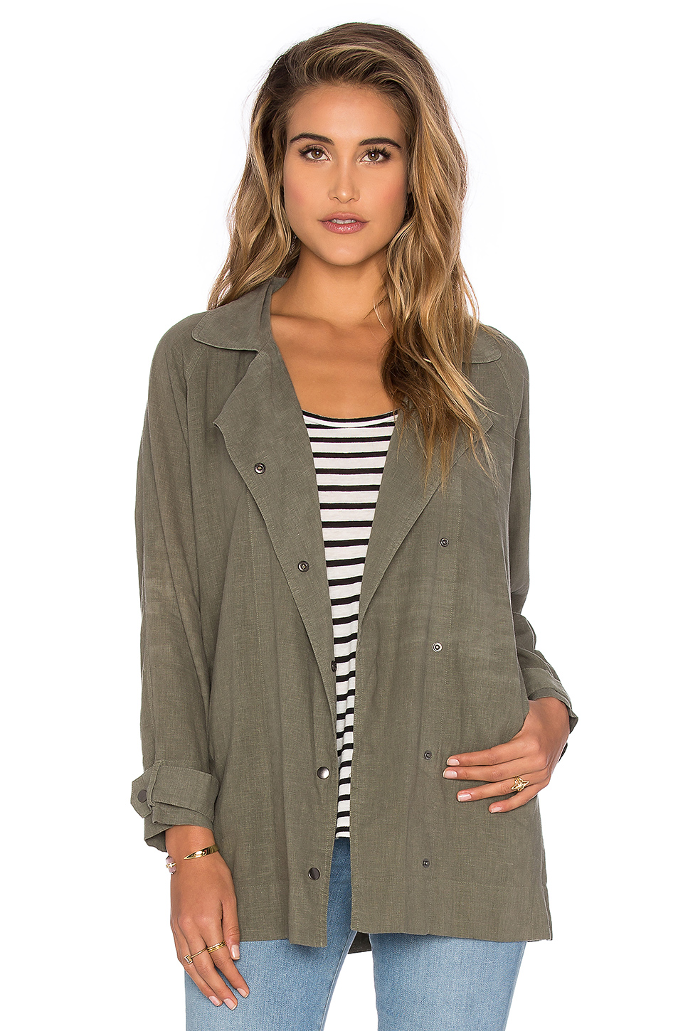 Her linen-blend jacket features a button front closure, side welt pockets, and button cuffed sleeves.
