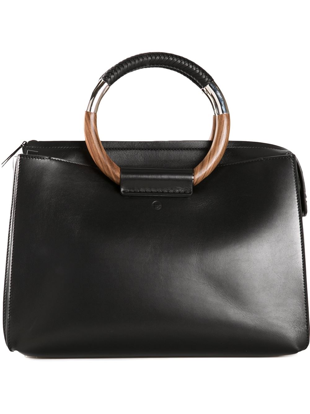 Her leather tote features a top zip, shoulder strap, the brand’s silver-tone logo plaque, and two wooden and woven leather round top handles.