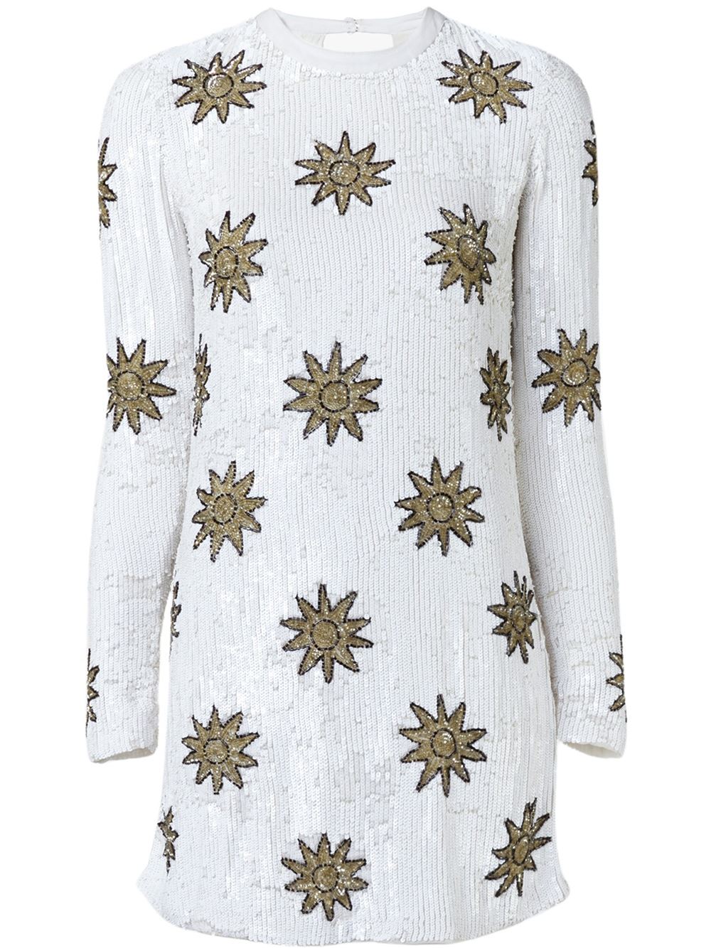 Her white and gold dress features an allover sun print, long sleeves, and sequin embellishment.