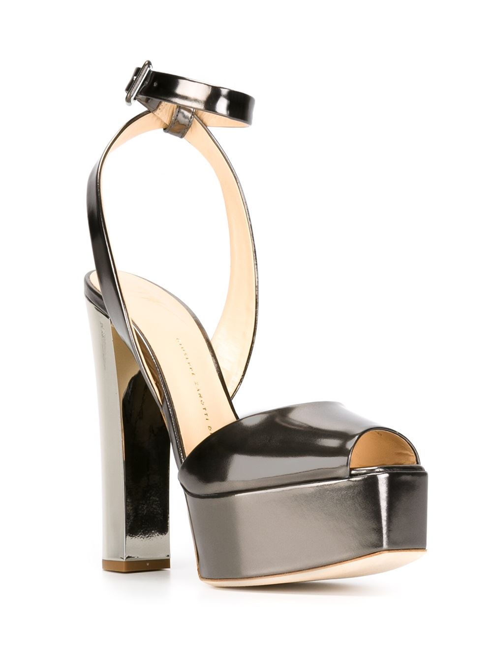 Her silver-tone leather sandals feature a peep-toe silhouette, adjustable buckled ankle straps, and sky-high 5.9″ block heels.