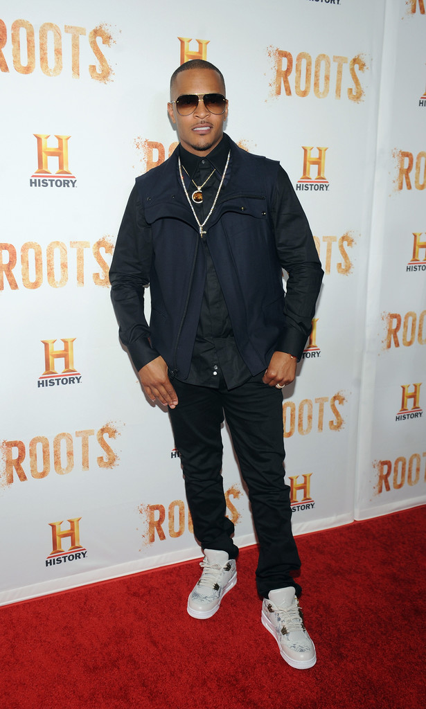 T.I. kept it casual, but polished in a black and navy ensemble, anchored by Jordans.