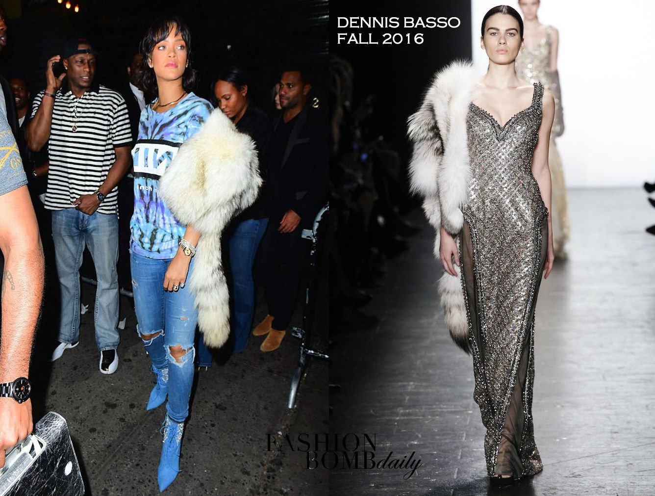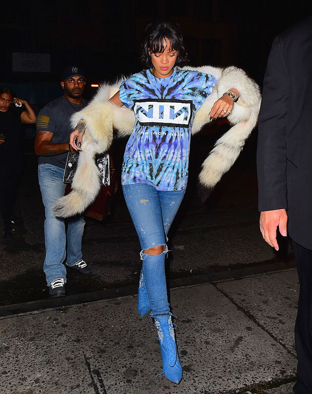 Rihanna partied at Up and Down in NYC in a Dennis Basso Fall 2016 fur stole, Nine Inch Nails Vintage 90’s Tie Dye Tour T-Shirt and $2,435 Rihanna x Manolo Blahnik Dancehall Cowgirl Jewel Denim Booties: