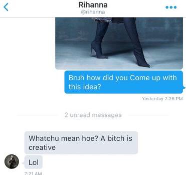 According to a screenshot posted to Complex, the Bajan prince replied: “Whatchu mean hoe? A b*tch is creative.” And indeed she is. Boasting positions as the creative director of both Puma and Stance Socks as well as a collaborative ambassador role with Dior — not to mention her penchant to turn out whatever red carpet (or sidewalk) she happens to be on — the Anti star is the definition of creative.