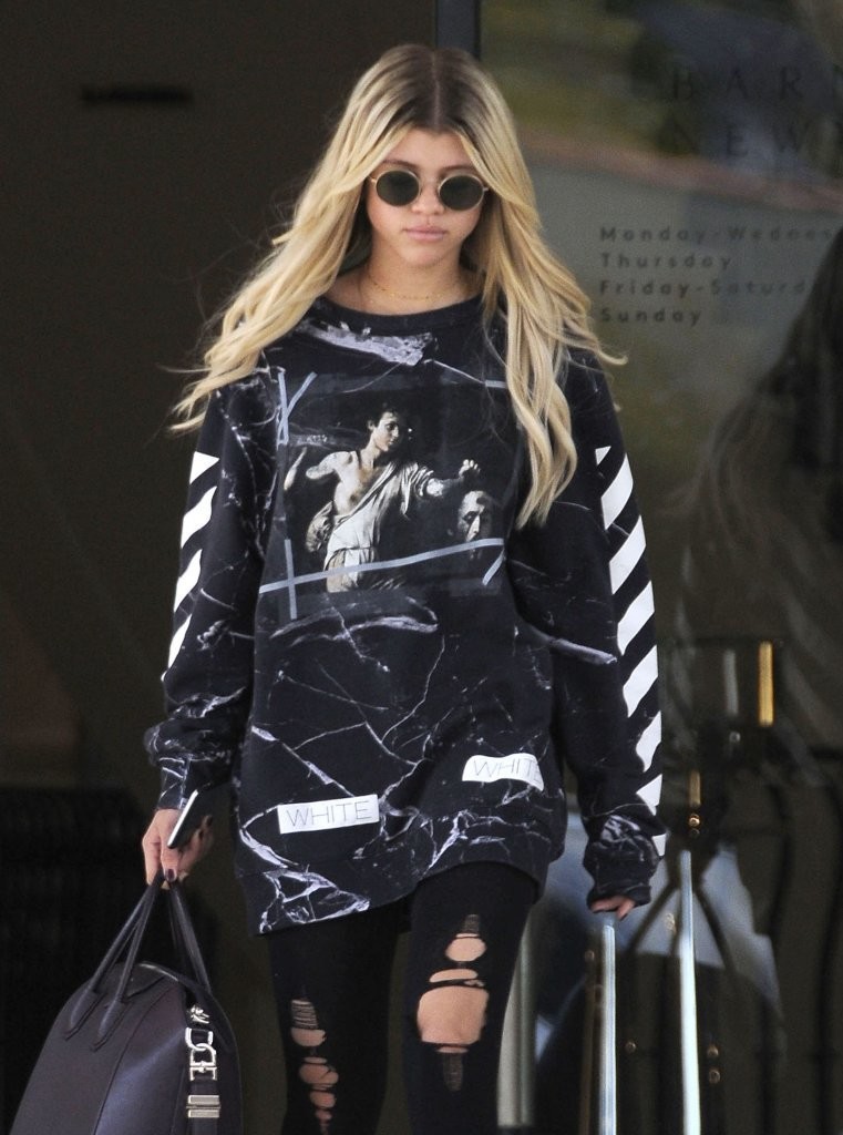 Sofia Richie indulged in some retail therapy at Barney’s in Beverly Hills, wearing a $365 Off White Black Printed Marble Pullover: