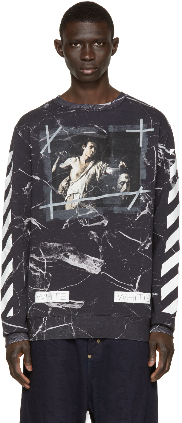 Her artful graphic pullover features the brand’s logo and signature diagonal stripe pattern, a crewneck collar, and tonal stitching.
