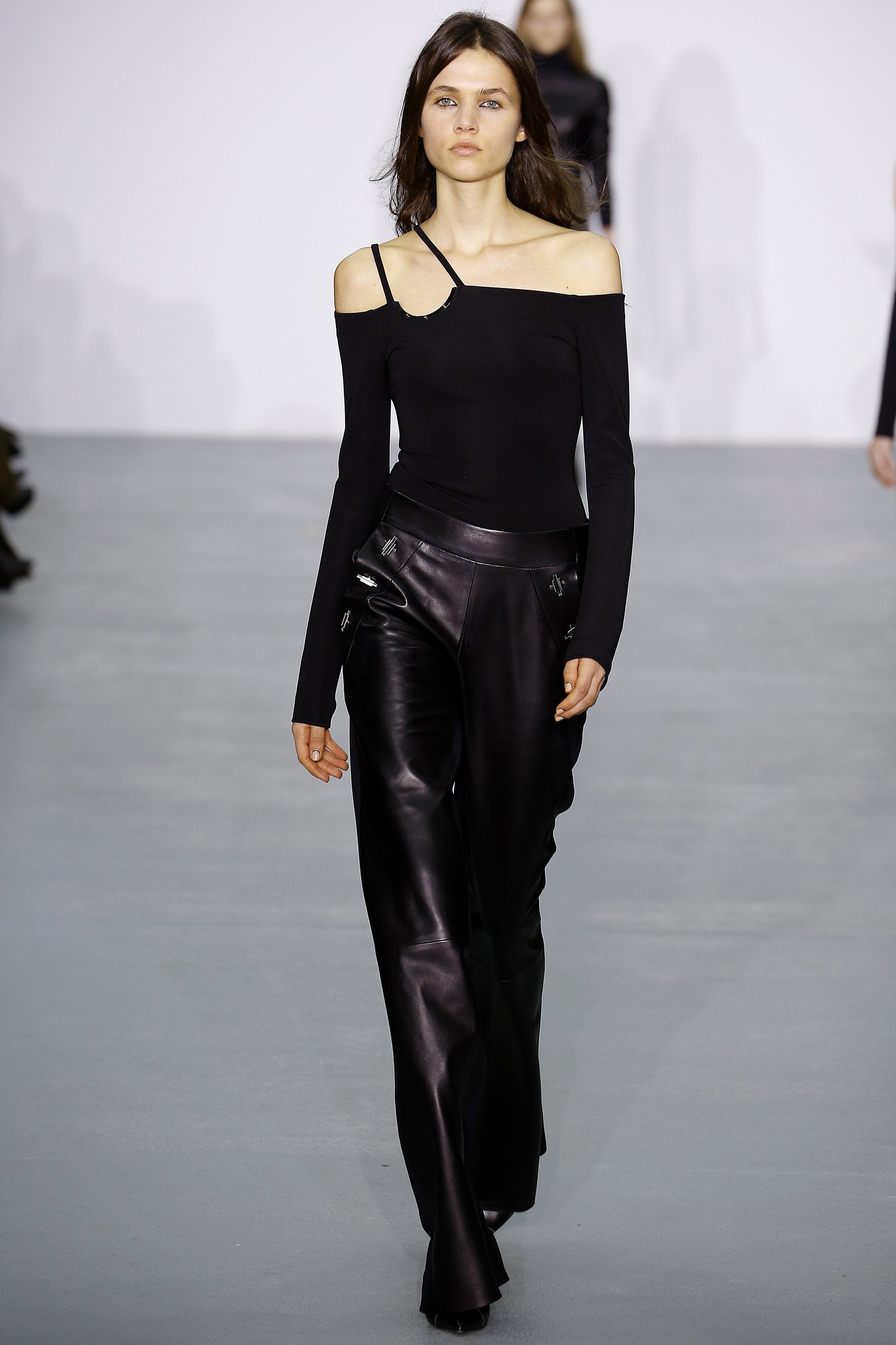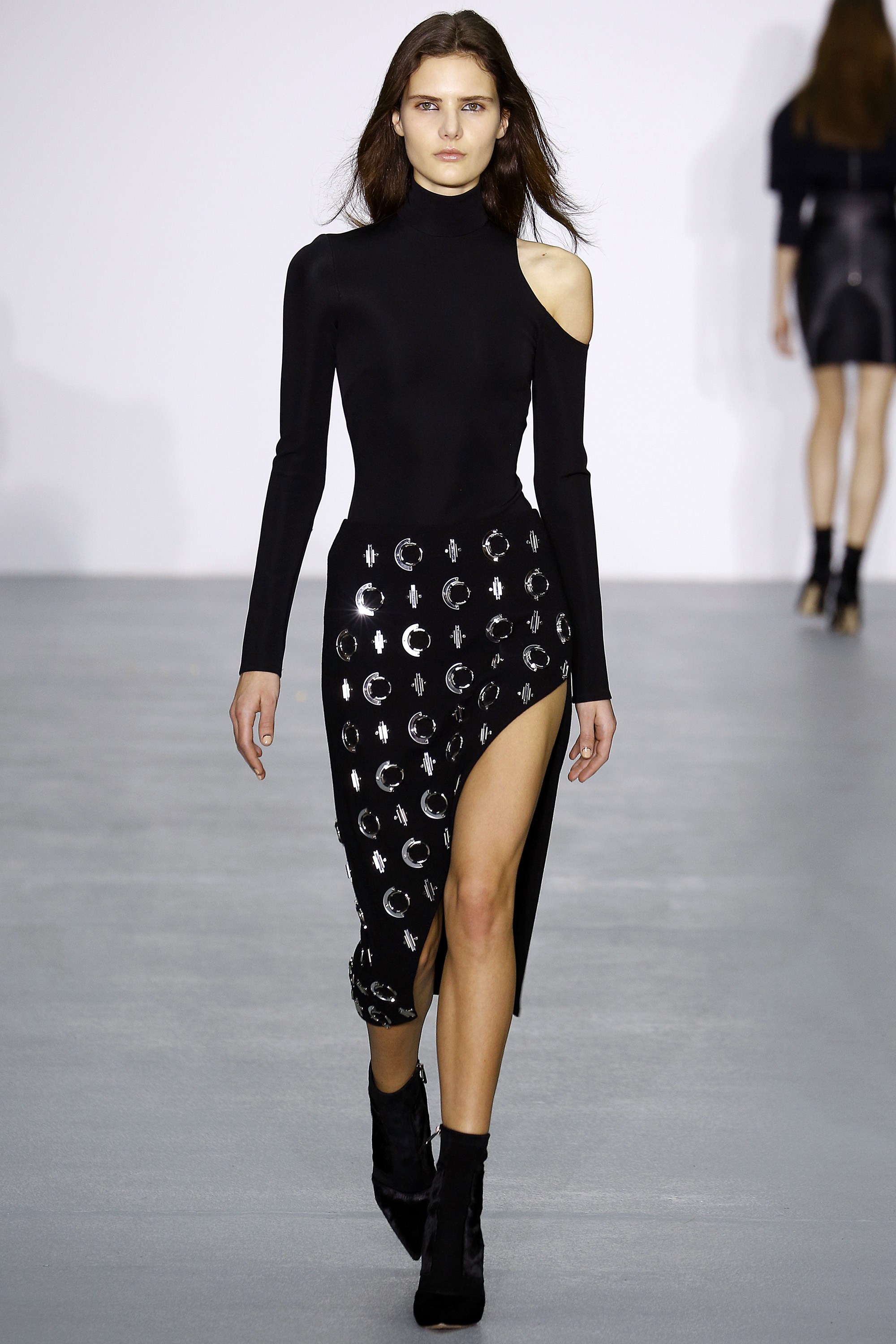 Her top was shown with leather trousers and a cutout shoulder turtleneck and black booties complemented her statement-making skirt.