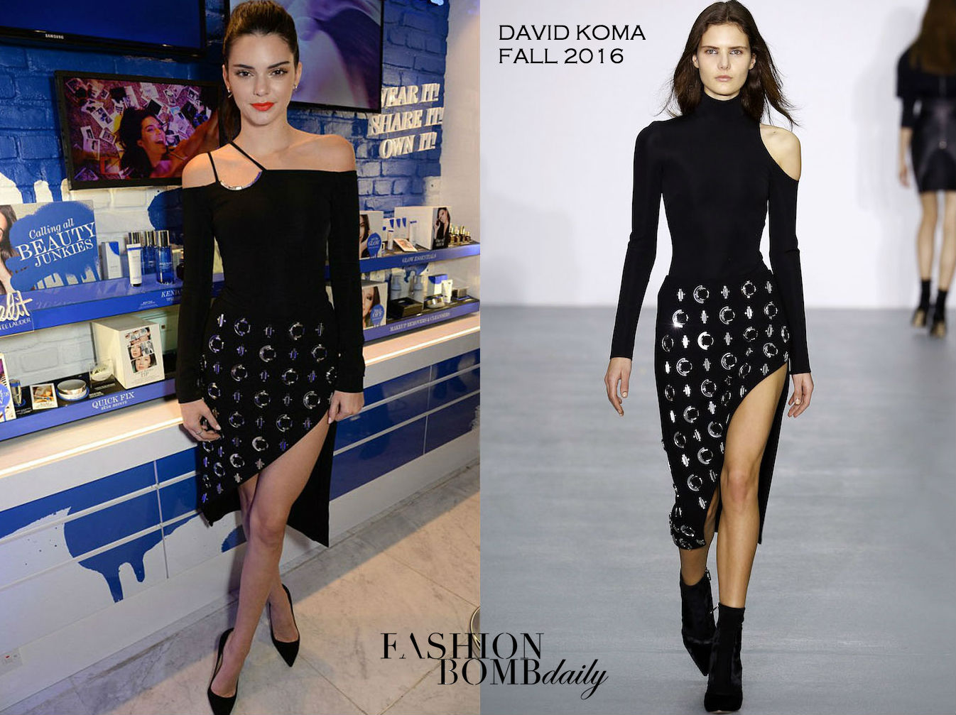 Kendall Jenner looked every bit the model at The Estee Edit Selfridges Launch in a David Koma Fall 2016 Black Asymmetric Top and Crystal Embellished Slit Skirt: