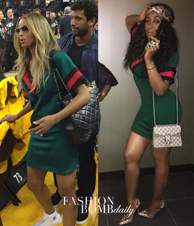 Ciara attended tonight’s Warriors vs. Cavaliers Championship game in the same green knit Gucci dress previously worn by Marlo Hampton.