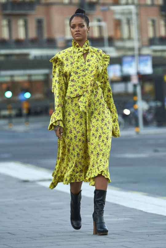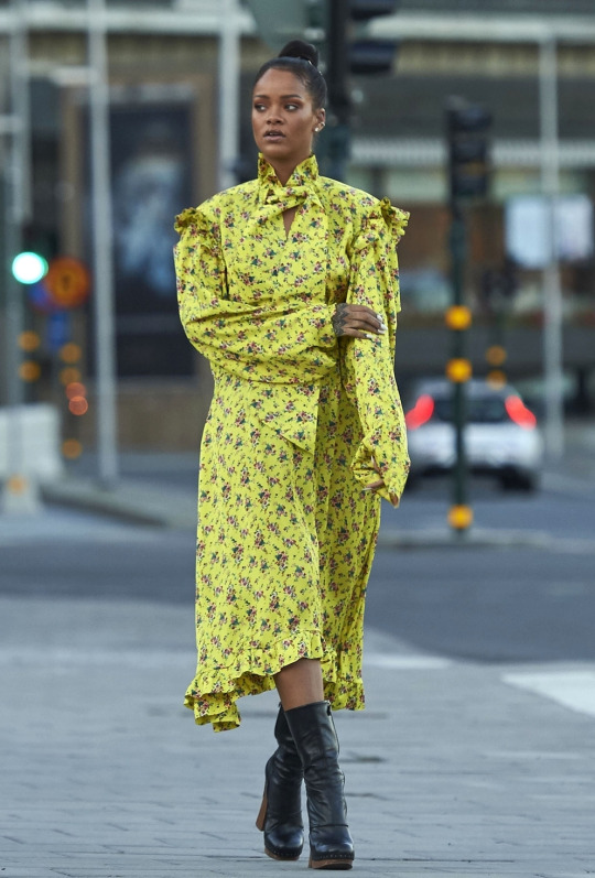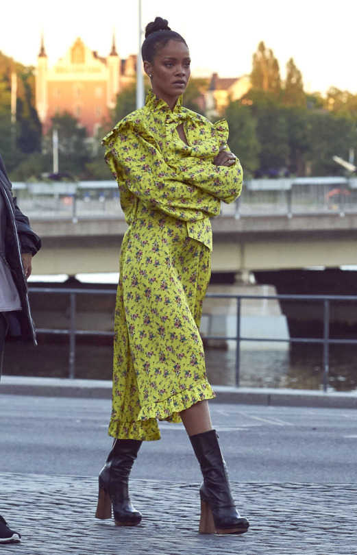 Rihanna roamed the streets of Stockholm, Sweden with her friends in a Vetements Spring 2016 $1,025 Yellow Ruffle Dress: