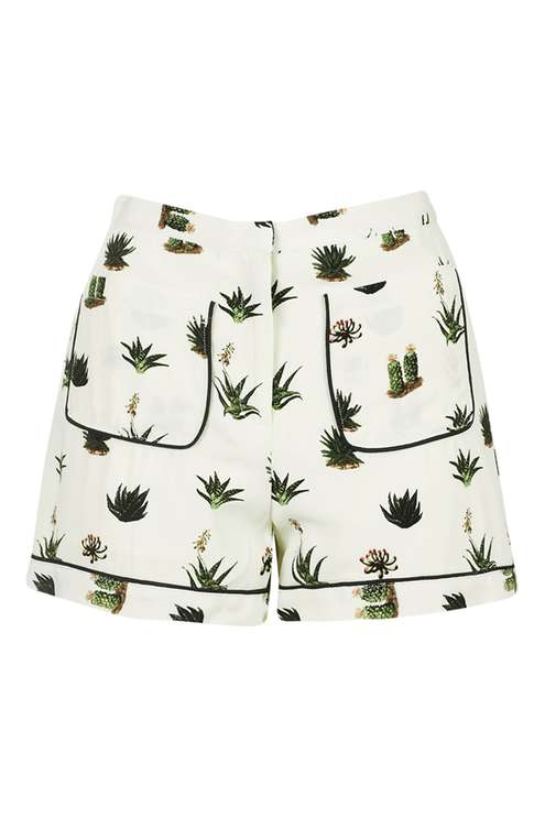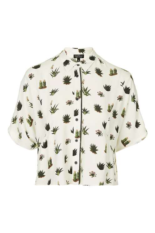 Her loose fitting pyjama-style blouse is crafted in a luxe cactus print, and features a classic button down design, with contrast piping to the placket.
