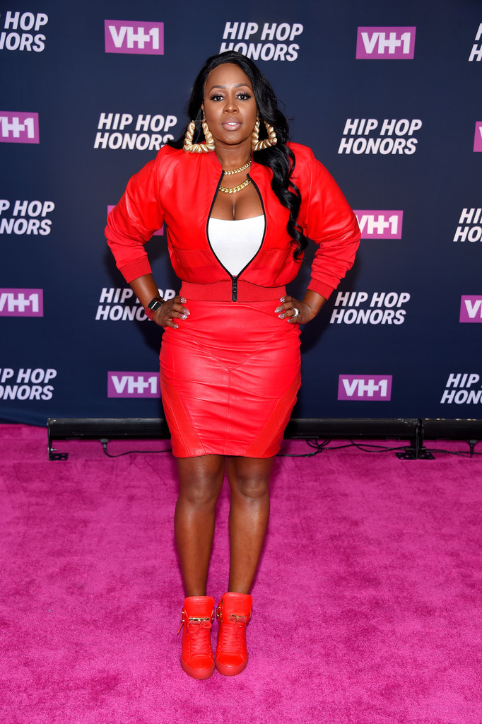 Remy Ma went for old school flavor in red leather, doorknocker earrings, and Buscemi sneakers.