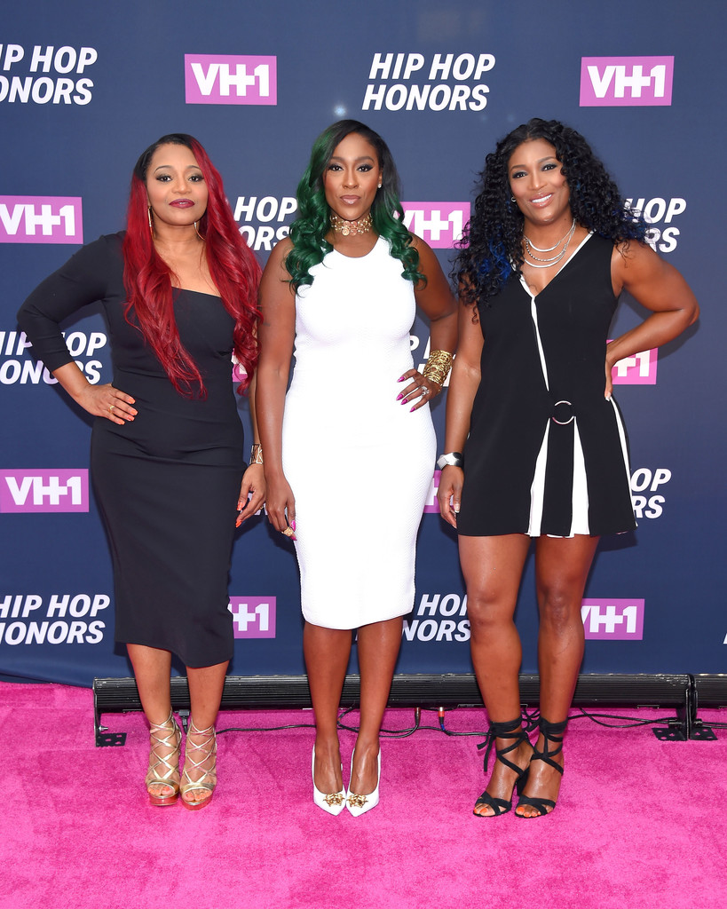 Salt, Pepa, and Spinderella coordinated in black and metallic hues.