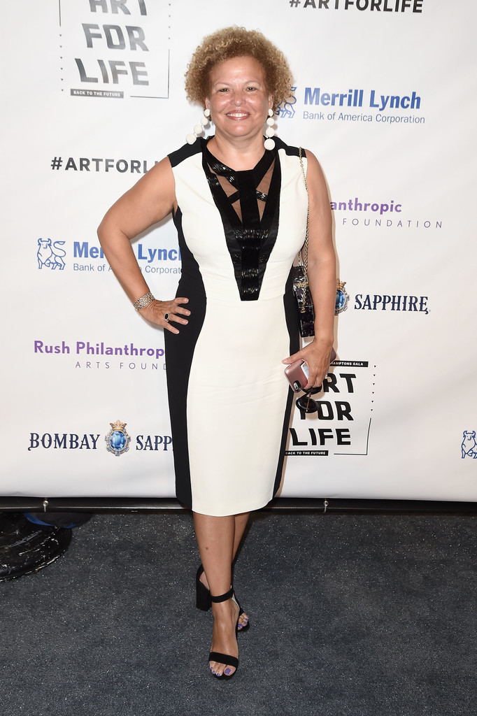 BET’s Debra Lee worked a black and white sheath and jazzy earrings.