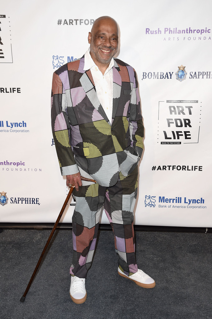 Russell Simmons added a color blocked bowtie to a tailored suit.