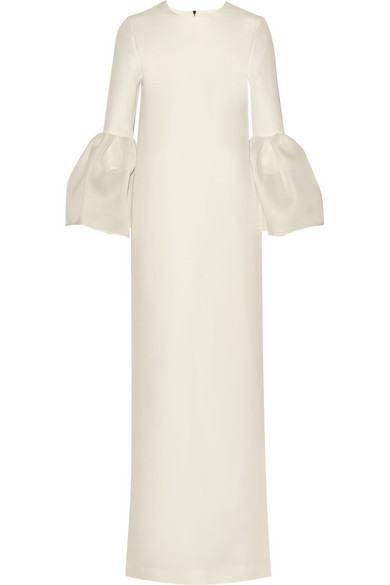 The slick, form fitting sheath boasts lantern sleeves equipped with gazar cuffs. See a similar style by the designer below: