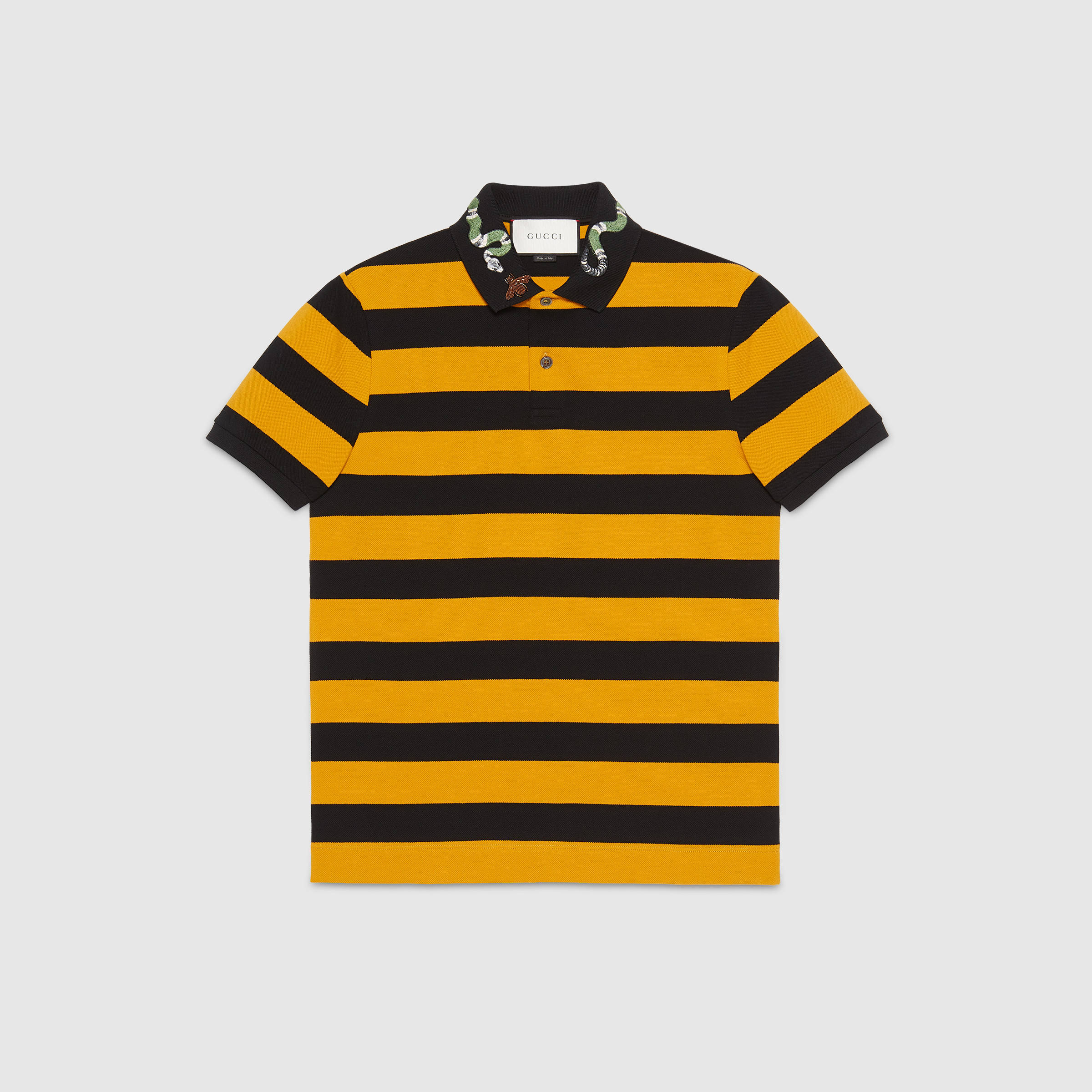 An embroidered snake appliqué is applied along the collar of this polo accented with a gold embroidered bee detail, a new iconic symbol for Gucci.