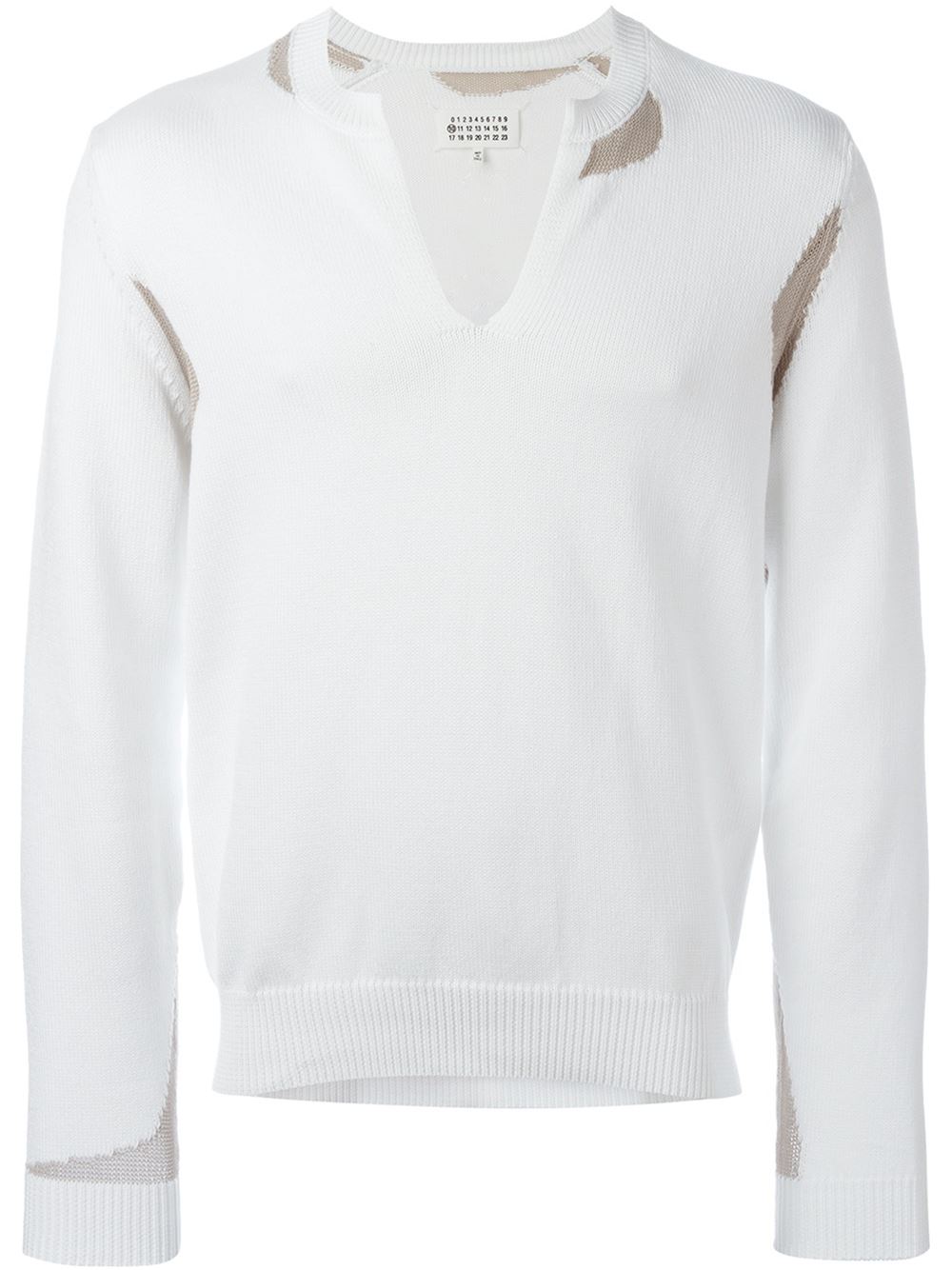His white and grey cotton blend intarsia knit sweater has a key-hole neckline, long sleeves and a ribbed hem and cuffs.