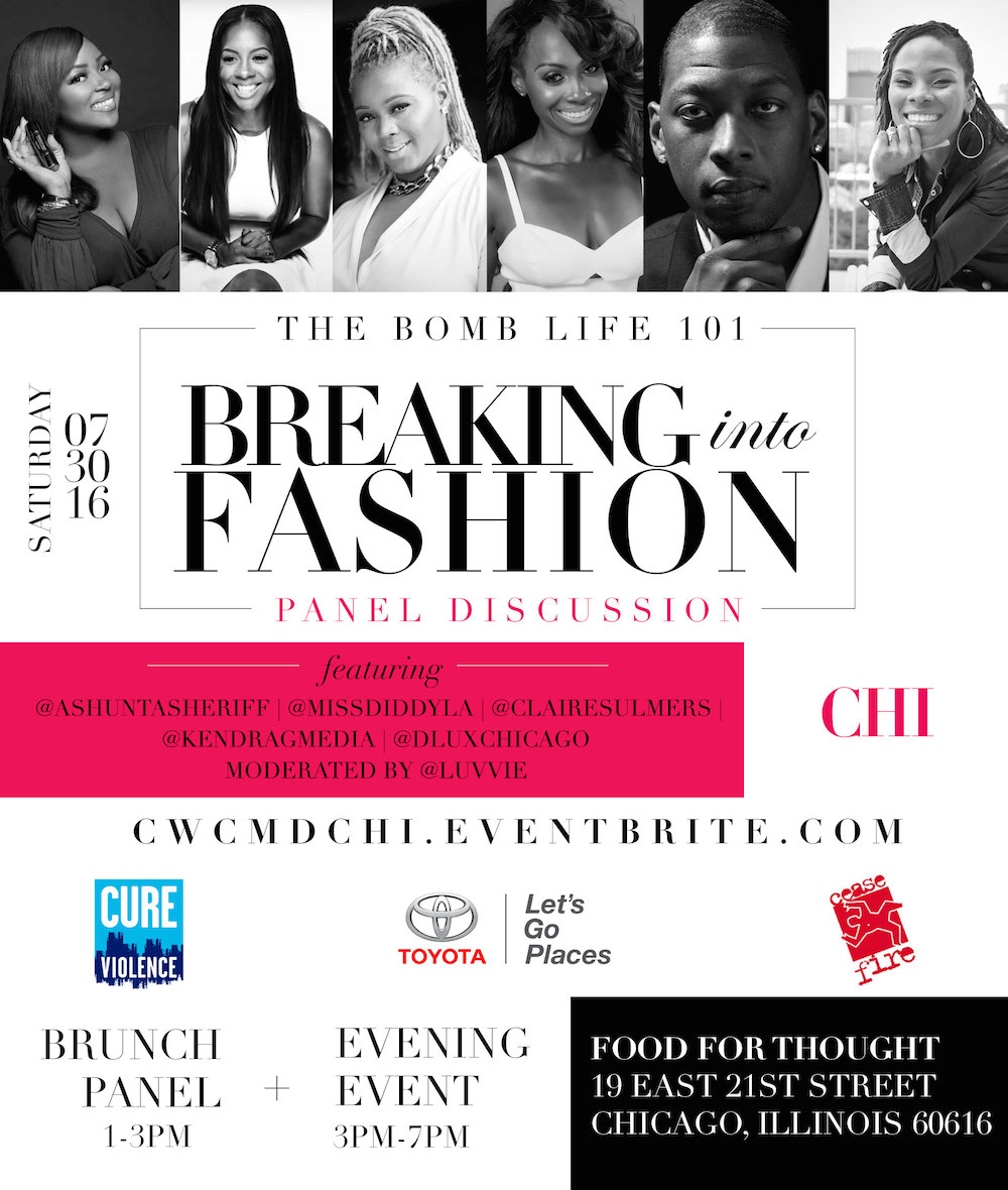 The day will include a Breaking into Fashion panel, featuring D Lux Chicago’s Bobby Simmons, radio personality Kendra G, makeup artist Ashunta Sheriff, Miss Diddy, and yours truly, moderated by Awesomely Luvvie!