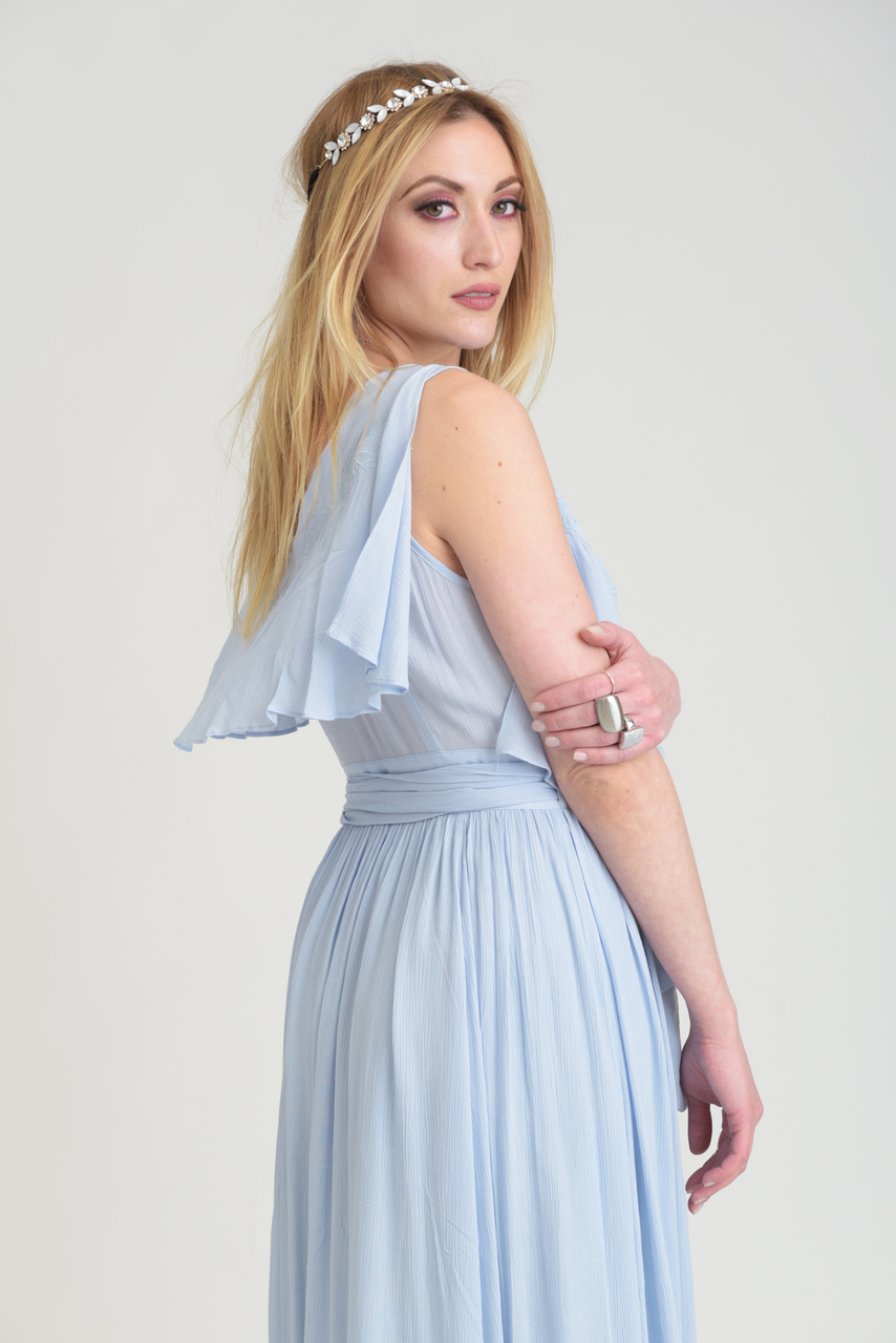 The summer piece has a deep V, fluttery sleeves, and a back collar.