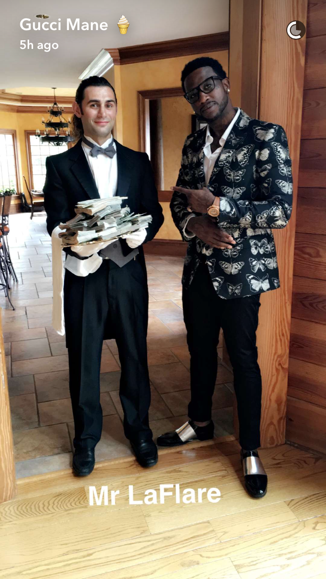 0 Gucci Mane's Snapchat Video Alexander McQueen Fall 2016 Butterly Blazer and Black and Silver Jimmy Choo Loafers