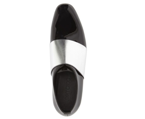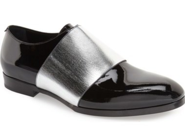 His patent leather loafers boast a metallic strap.