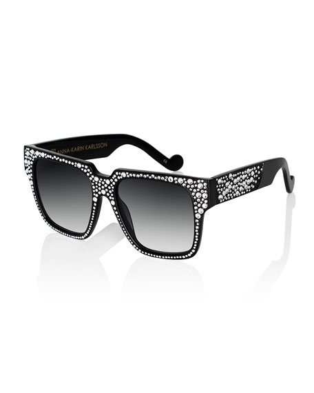 *In another scene, Gucci poses in an Exclusive Access sweater, Rag & Bone Jeans, $375 Margiela double strap silver sneakers, and $985 Anna Karin Black and Crystal sunglasses.