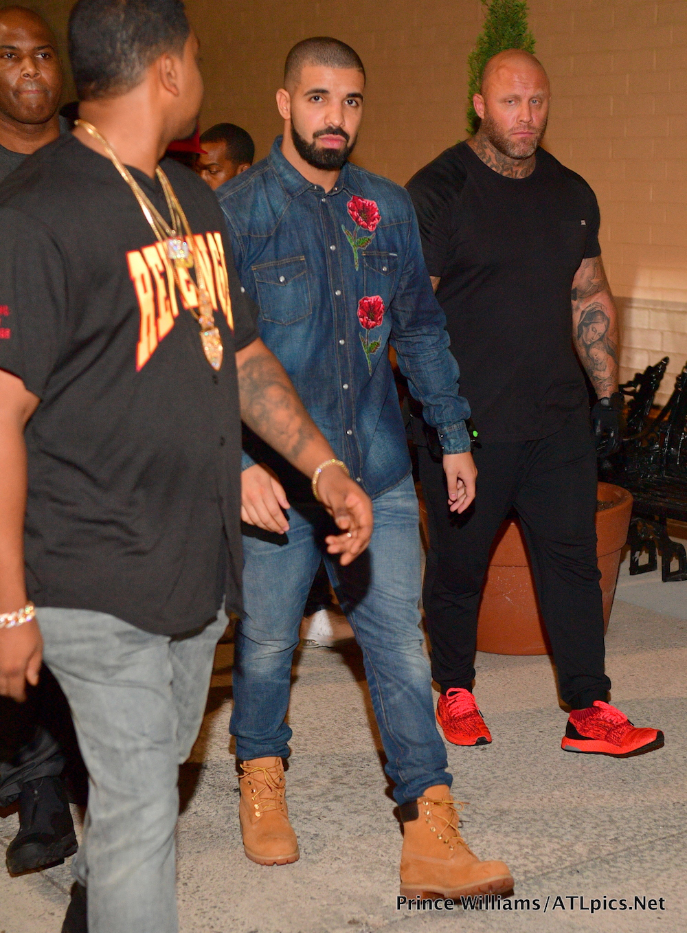 Drake hit Atlanta’s Mansion Elan $633 Rose Embroidered Denim Shirt.