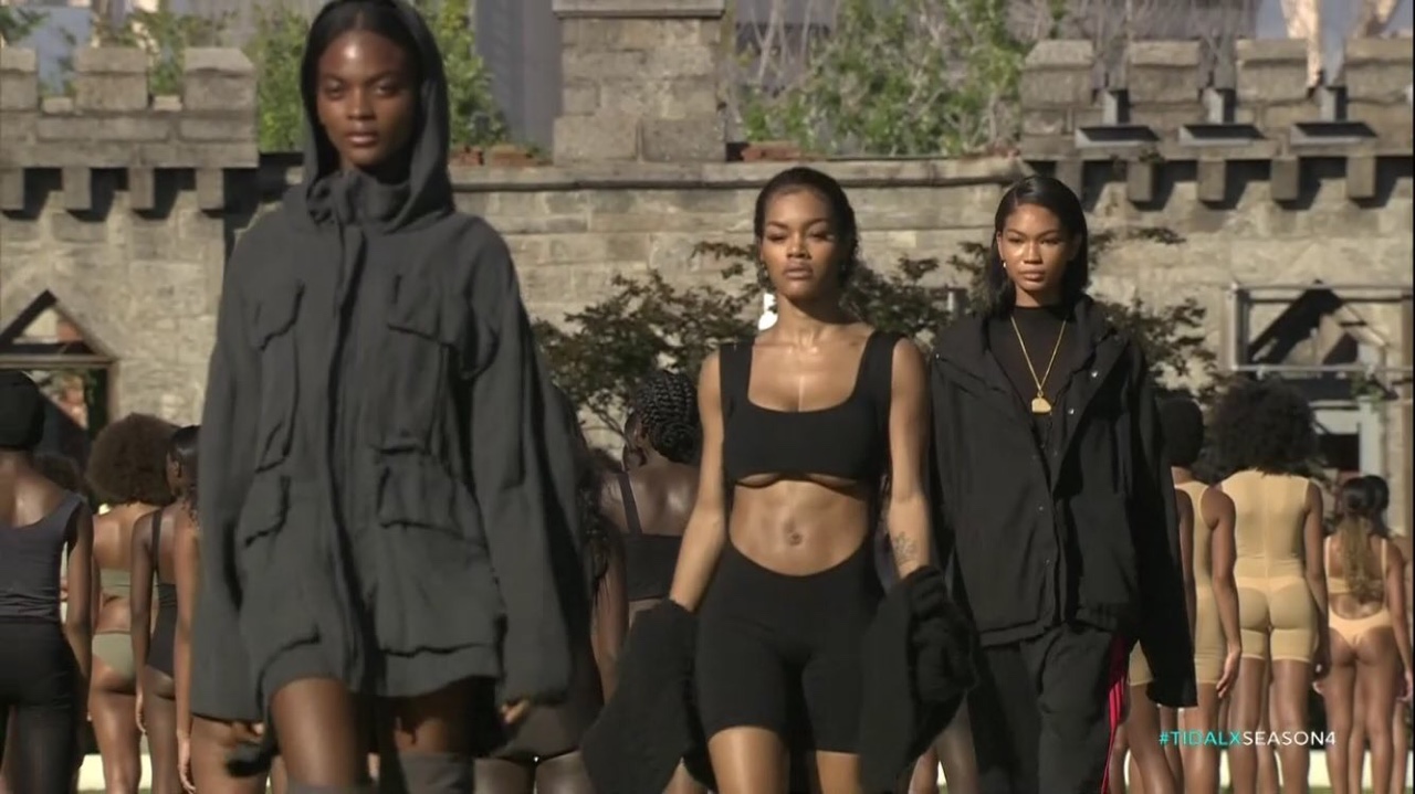 Teyana Taylor showcased her abs in a black cut out unitard and booties, followed by Chanel Iman, also clad in black.