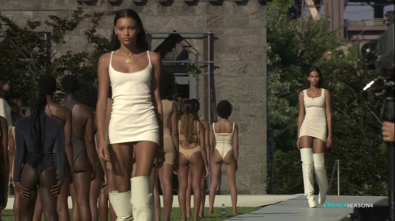 But overall the show offered a sleek continuum of the sporty, minimalist, monochromatic aesthetic for which Kanye’s Yeezy’s collections are known. Expect sheer, underboob, sports bras, leggings, close fit cocktails, and unitards in natural color palettes.
