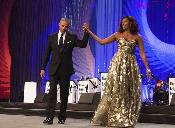 First Lady Michelle Obama wore a glamorous gilded Naeem Khan gown to the Phoenix Awards Dinner at the Walter E. Washington Convention Center.