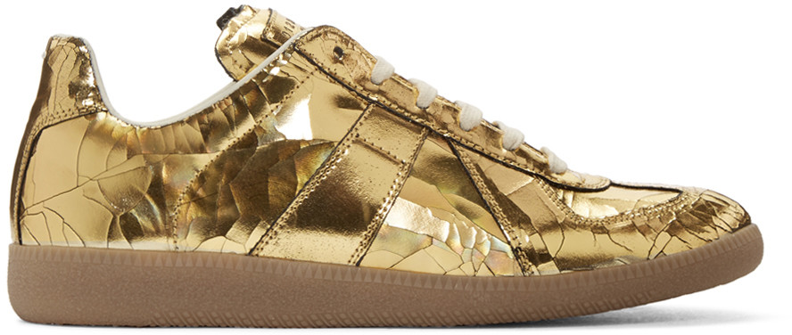 His sneakers have a cracked effect throughout.
