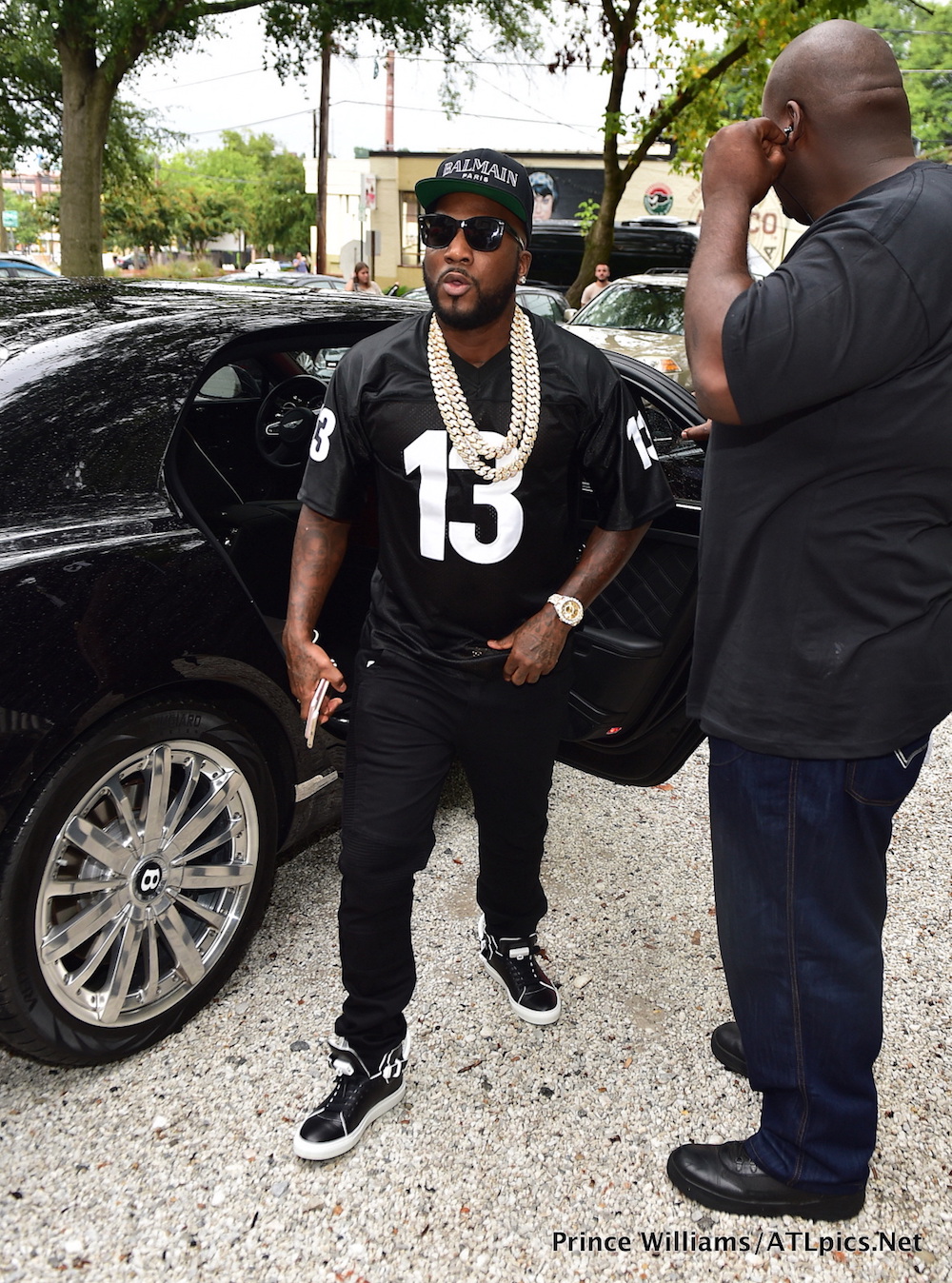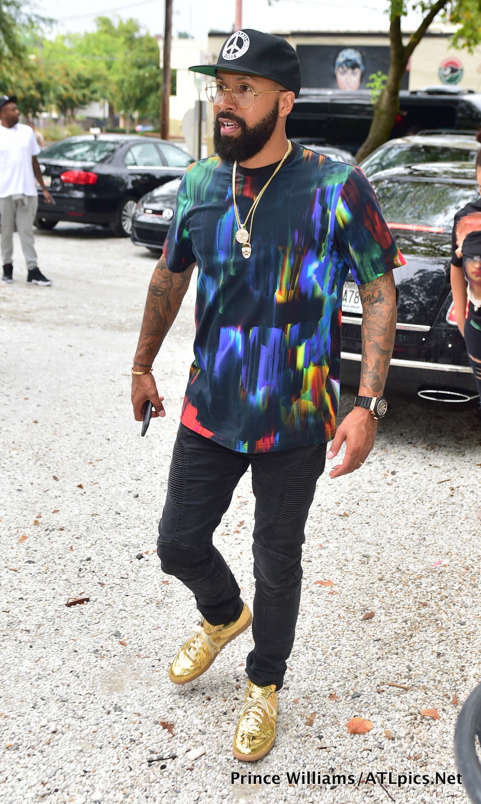 Kenny Burns attended a daytime event in Atlanta over the weekend in a $200 Y-3 Hand Painted Multicolor T-Shirt, Balmain Jeans, and Maison Martin Margiela sneakers:
