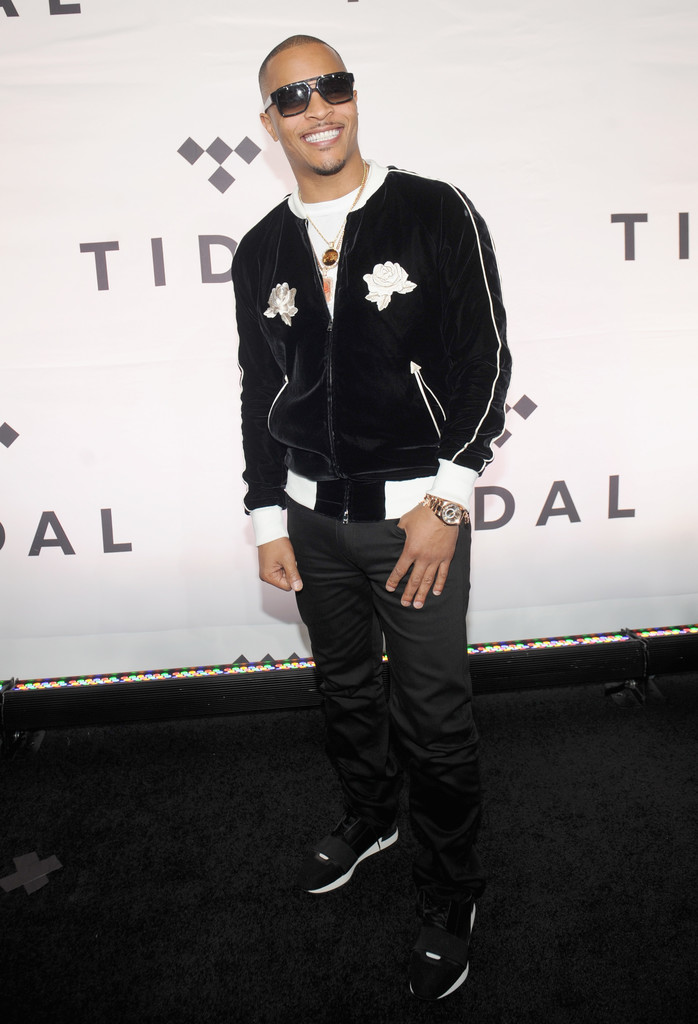 T.I. smiled bright in a rose embellished Bomber jacket.