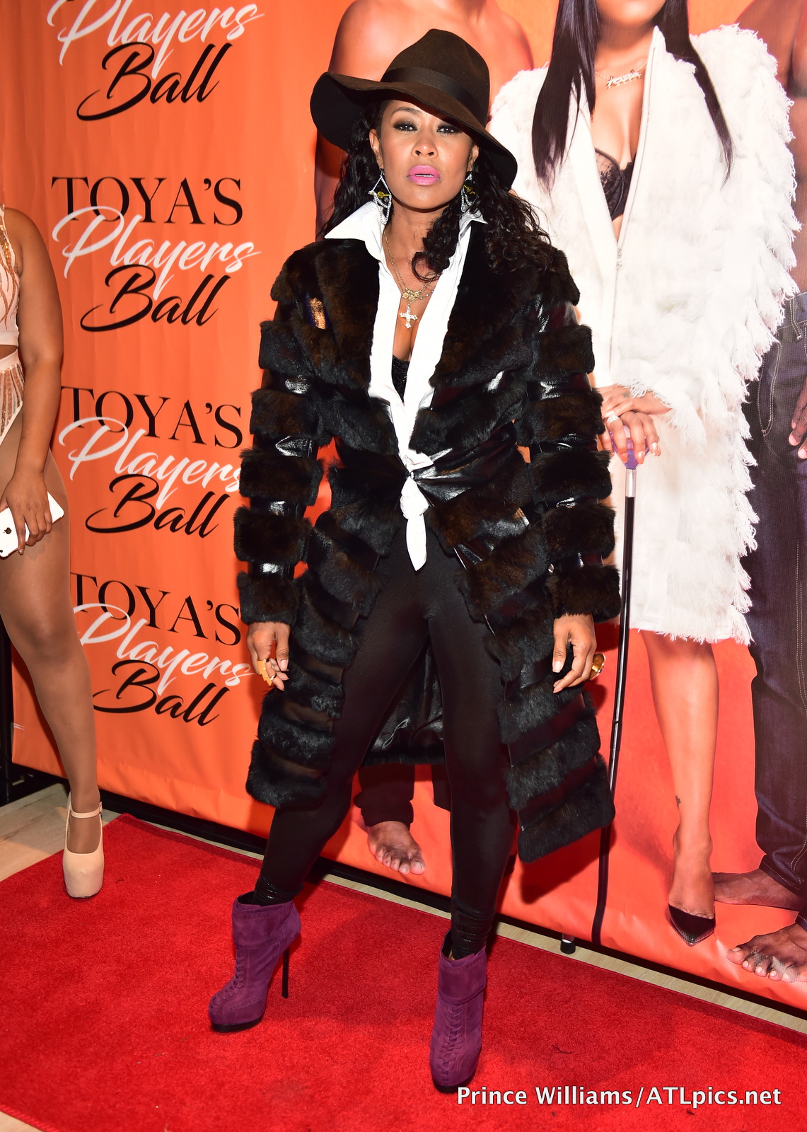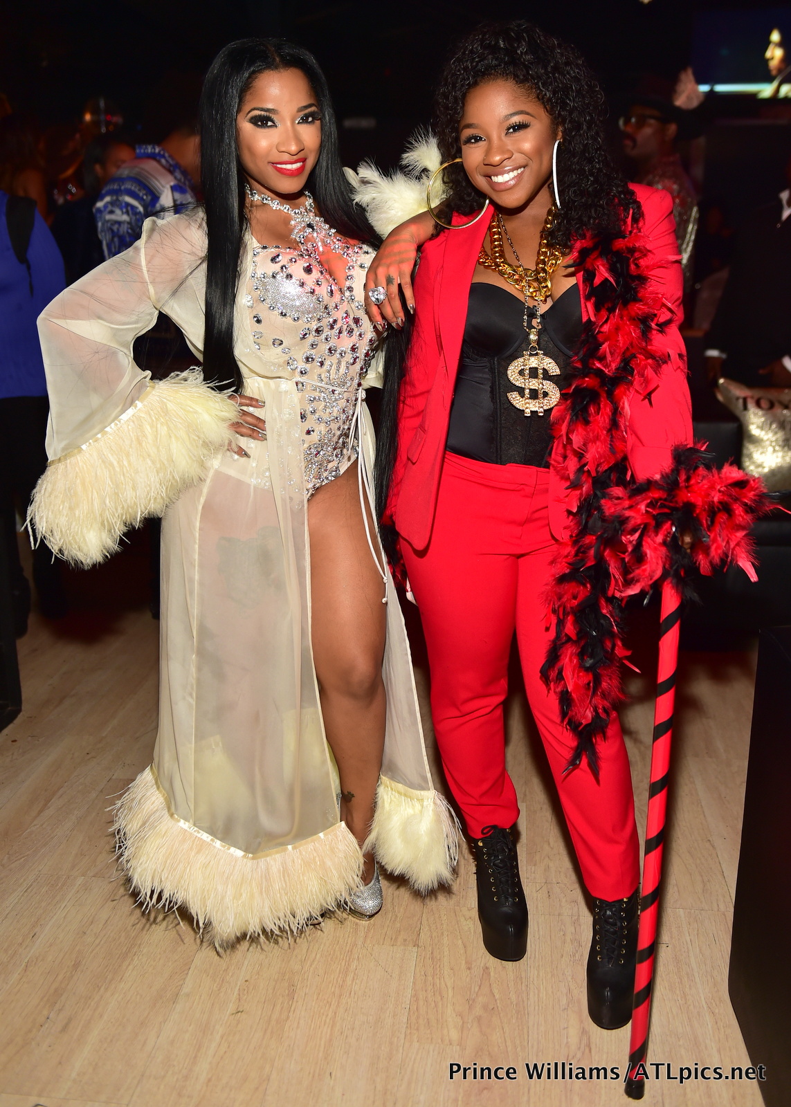 The hostess with the mostest Toya posed with friend Rick George in a bomb bejeweled bodysuit and a white fur coat.