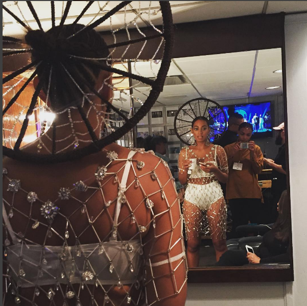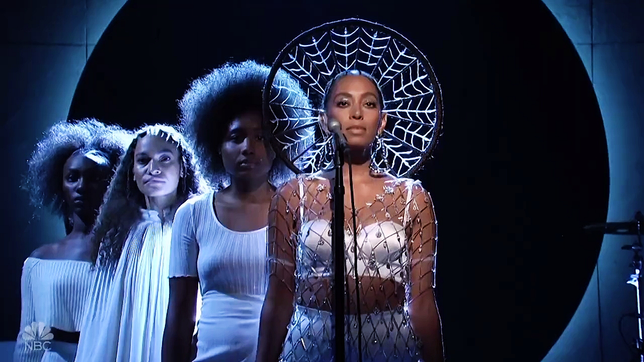 Solange Knowles took A Seat at the Table at Saturday Night Live last night, singing one of her most popular songs, Cranes in the Sky. The eclectic beauty went for 60’s inspiration in earrings and a custom crystal dress by Erickson Beamon, worn over a La Perla Silk Flair Bandeau Bra and Silk Flair Full Briefs.