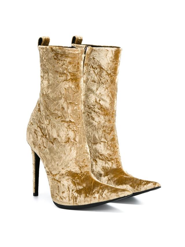 Her booties have a pointed toe.