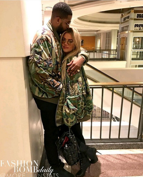 Khloe Kardashian and boo Tristan Thompson show some PDA in matching Ben Taverniti camouflage military style bomber jackets.