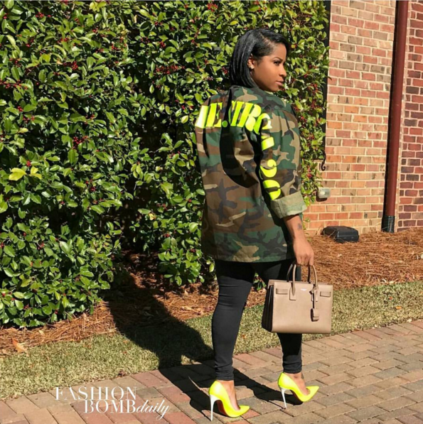 Toya Wright slipped on neon Louboutin pumps to match her neon accented Crate NY camo jacket.